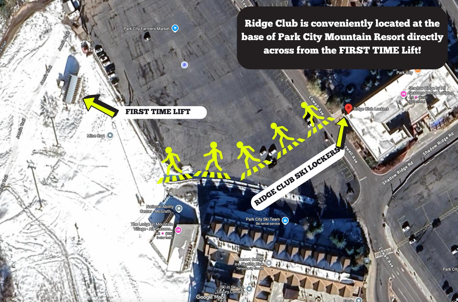 The Ridge Club is conveniently located at the base of Park City Mountain Resort. The ski lockers are less than 100 yards from the FIRST TIME lift. We are just across the parking lot.